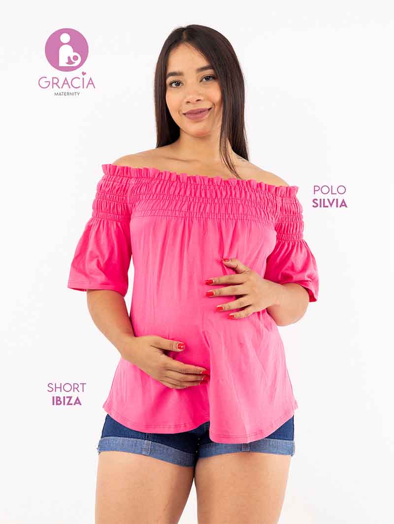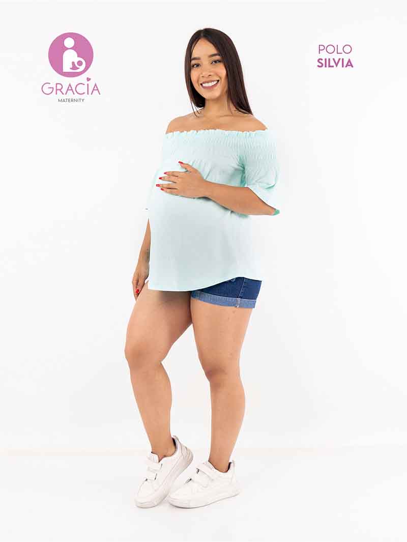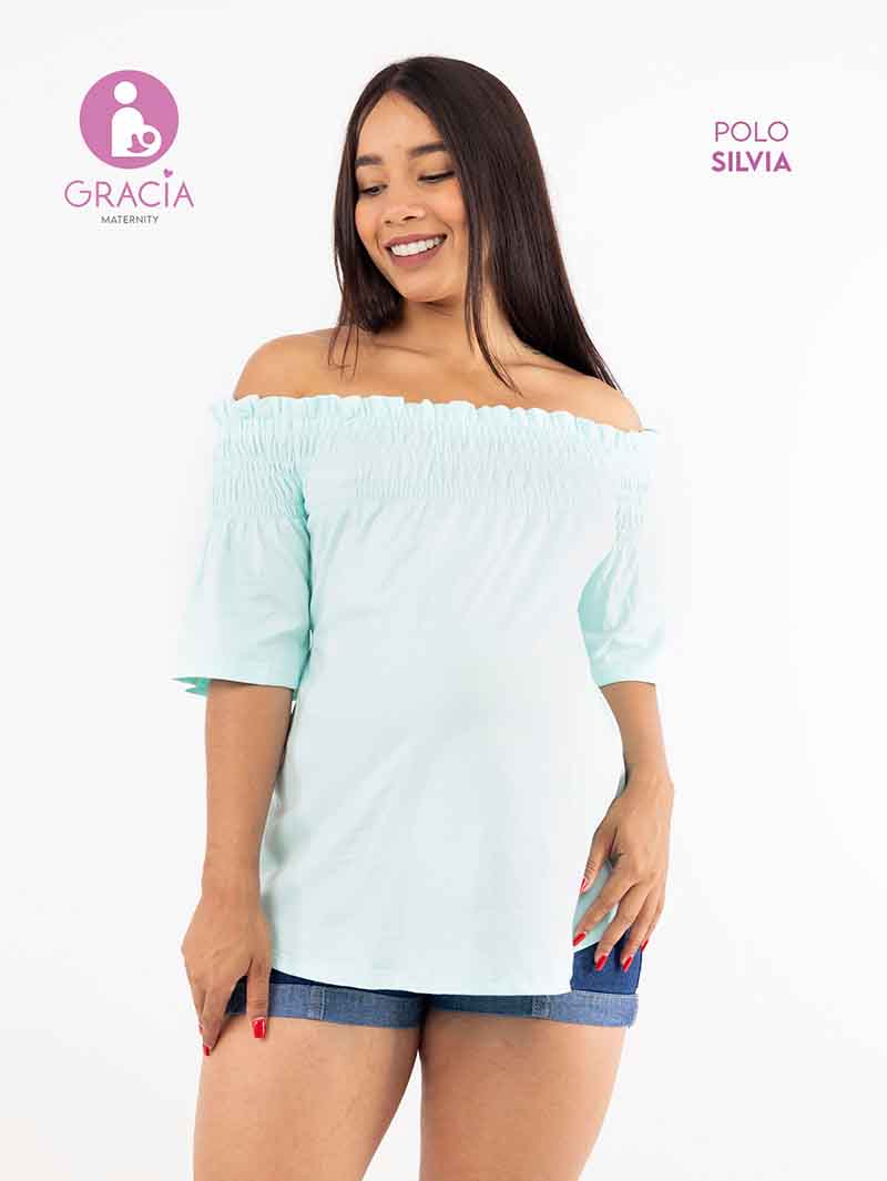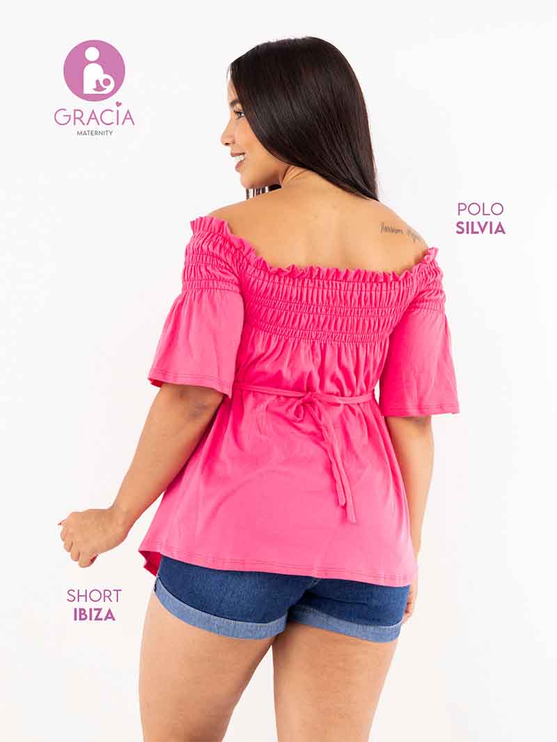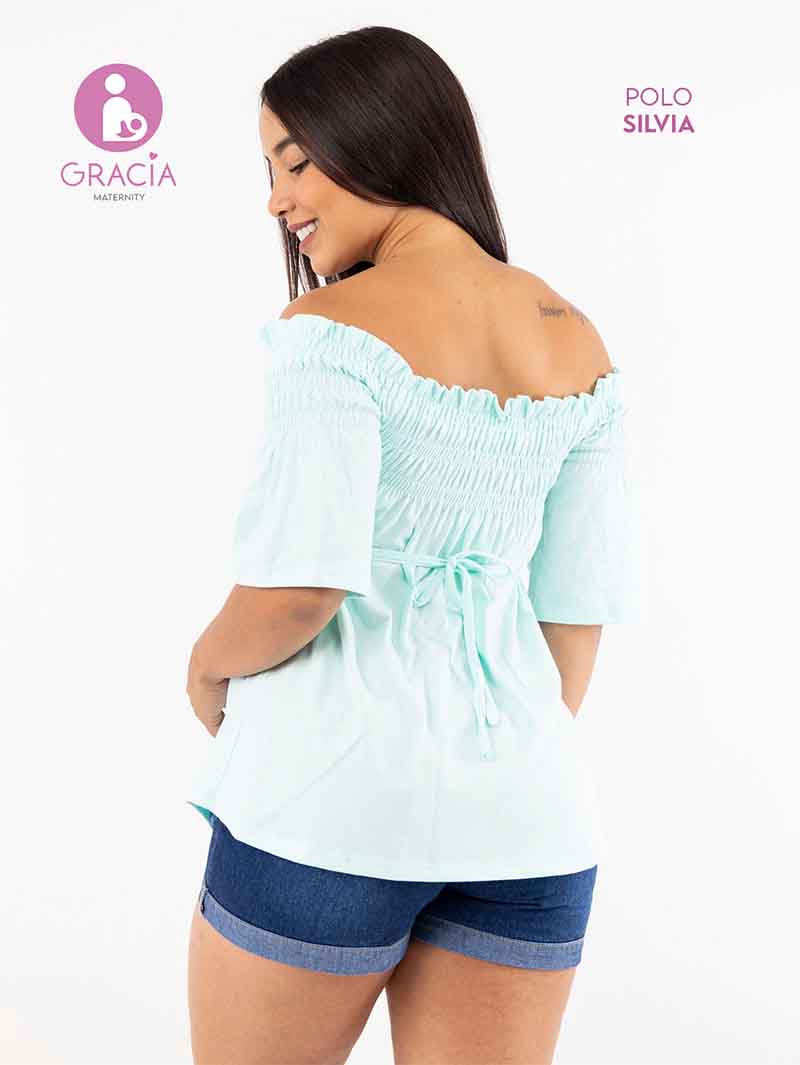 Polo Silvia, con un corrugado elástico en la parte superior pera usarlo tipo off shoulder y tiras en la parte trasera por si necesitas ajustarlo. Cuenta con mangas hasta los codos y es super cómoda para las que les guste un estilo más relajado y juvenil.